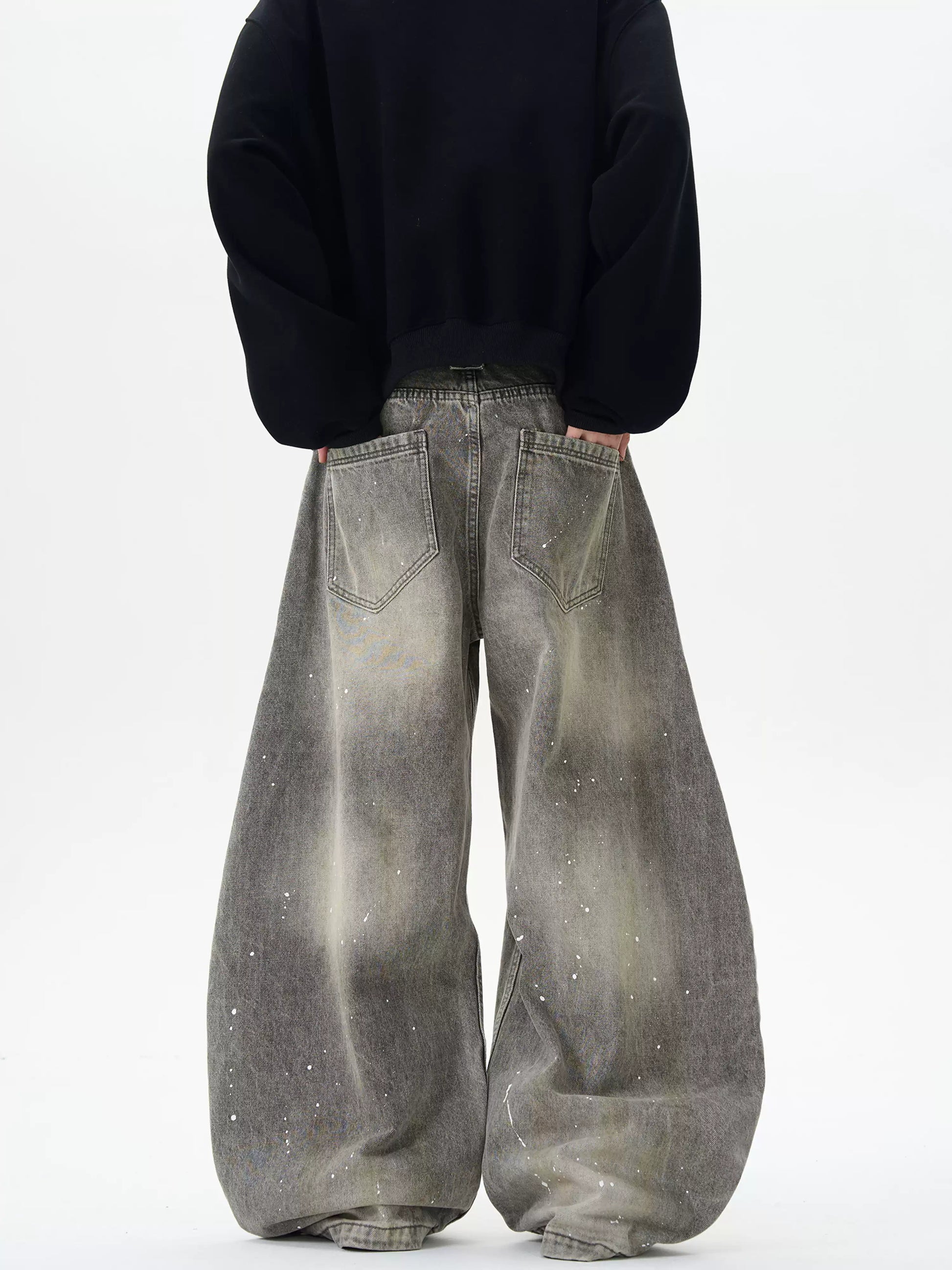 Washed Distressed Grey Ink-Splashed Scimitar Jeans